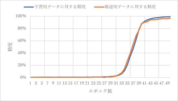 学習用データに対する精度と確認用データに対する精度はともに、30epoch程度までほぼ0%であるが、33エポックから41エポック間で90%程度まで上昇させていることがわかる。それ以降は上昇幅が緩やかになり、学習用データに対する精度は約100%、確認用データに対する精度は約97%となった。