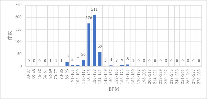 検証にはGiantSteps+ EDM Key Dataset [8](以降GS+と記載)を使用する。GS+では600曲のEDM(Electronic Dance Music)と呼ばれるジャンルの音楽が含まれている。テンポの情報はBPM値を修正する人々のフォーラム [9]によって手動で与えられたものである。テンポの情報が含まれている楽曲は600曲の内527曲である。図7にGS+データセットのBPM分布を示す。118BPMから141BPM間に446曲の楽曲があることがわかる。また30BPMから61BPM、190BPMから285BPM間の楽曲は0である。